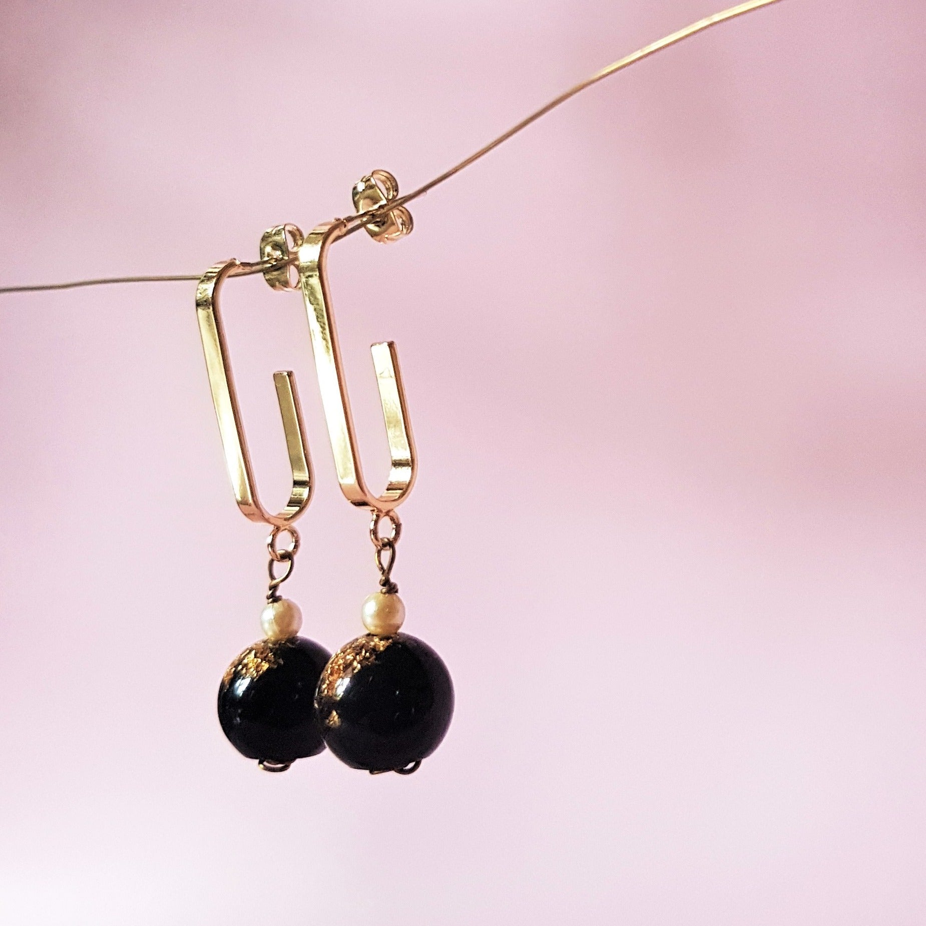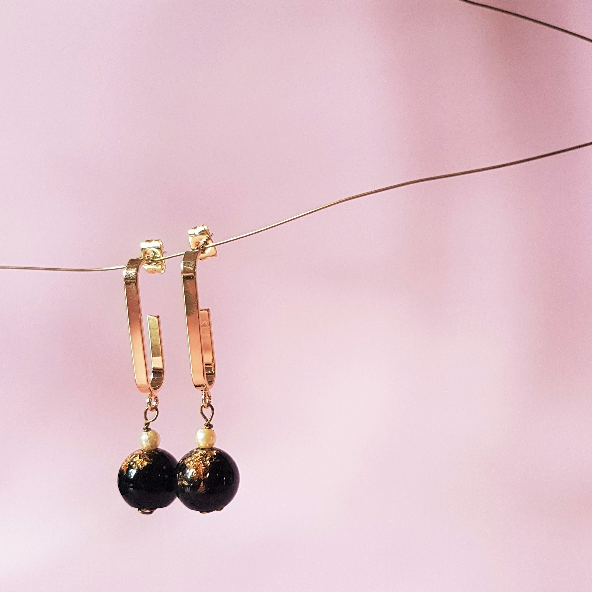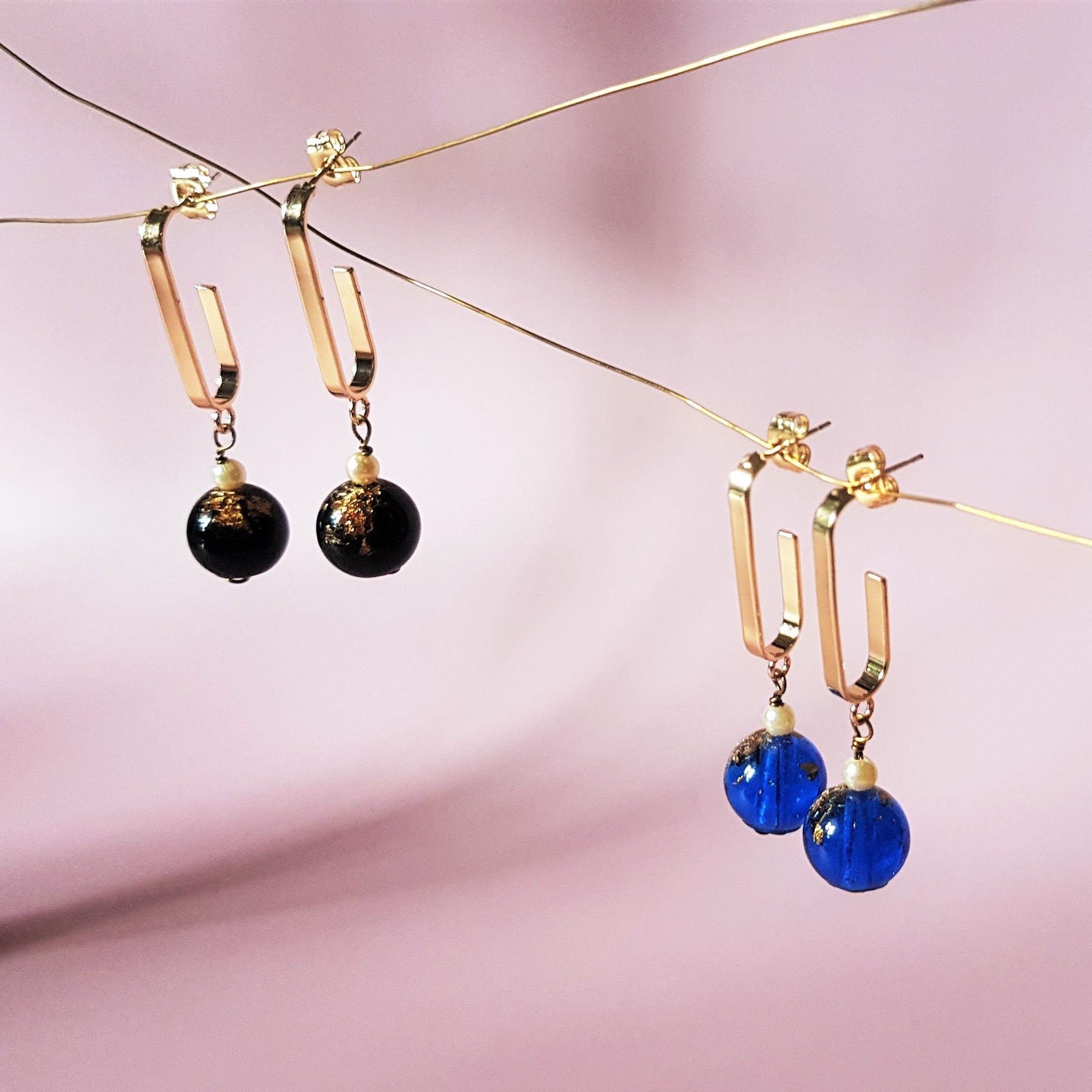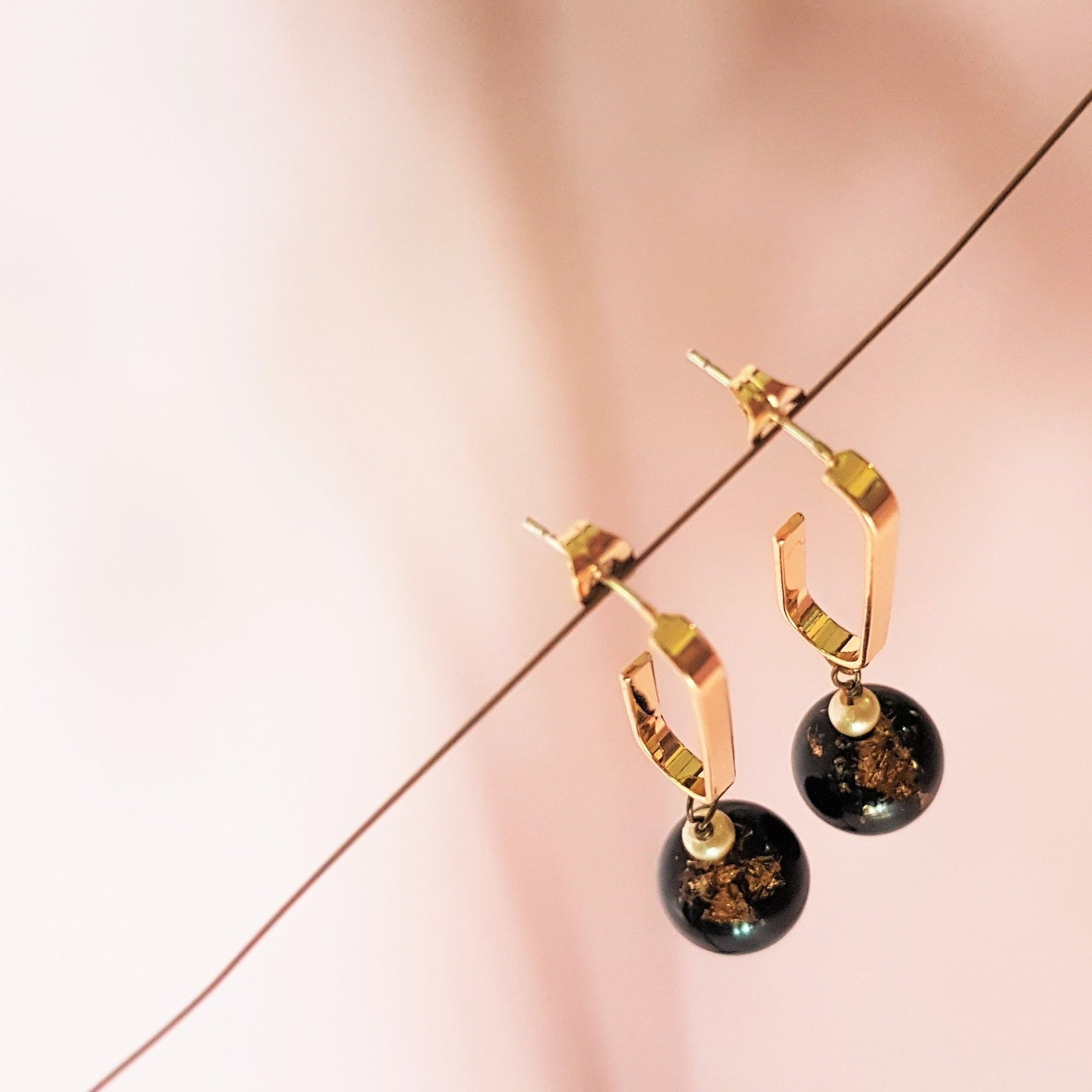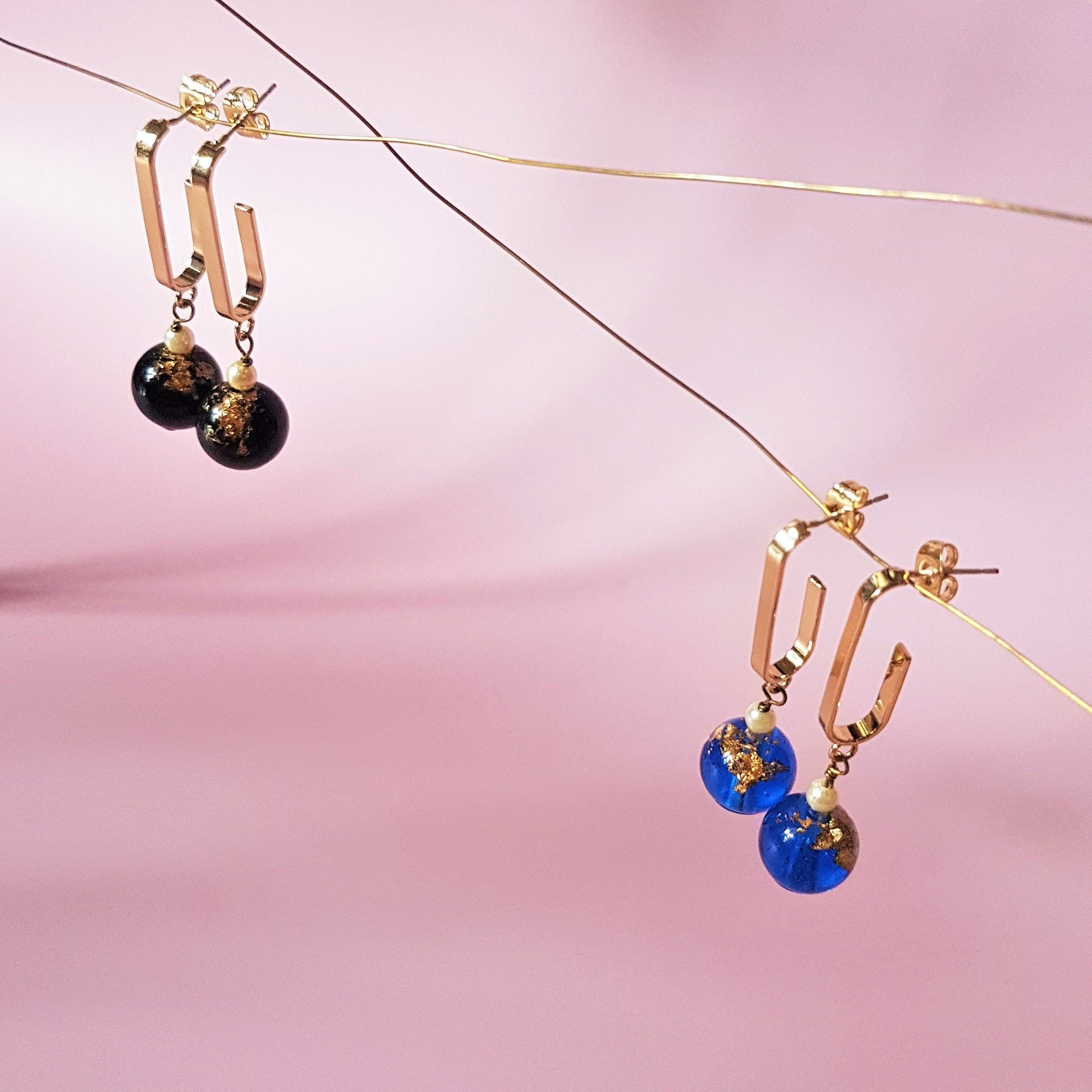 If you are looking for a pair of unique looped earrings, this is it! Available in blue and black resin beads, both infused with gold leaves.