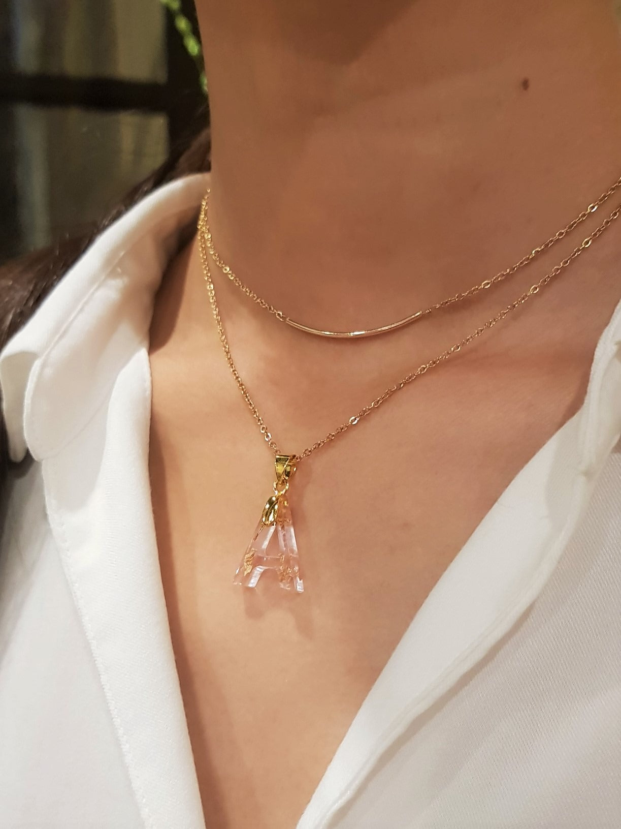 Kombinasi alfabet yang terbuat dari bahan resin, yang bisa kamu custom request sesuai keinginan dengan rantai gold memberi kesan manis dan mewah.